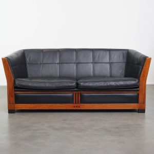 Stijlvolle 2.5-zits Art Deco design bank van Schuitema met mooi houtwerk en donkerblauw rundleer €1,825.00