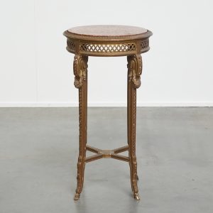 Antieke Franse ronde brocante bijzettafel met een goudkleurig houten frame en een kleurrijk marmeren blad €495.00
