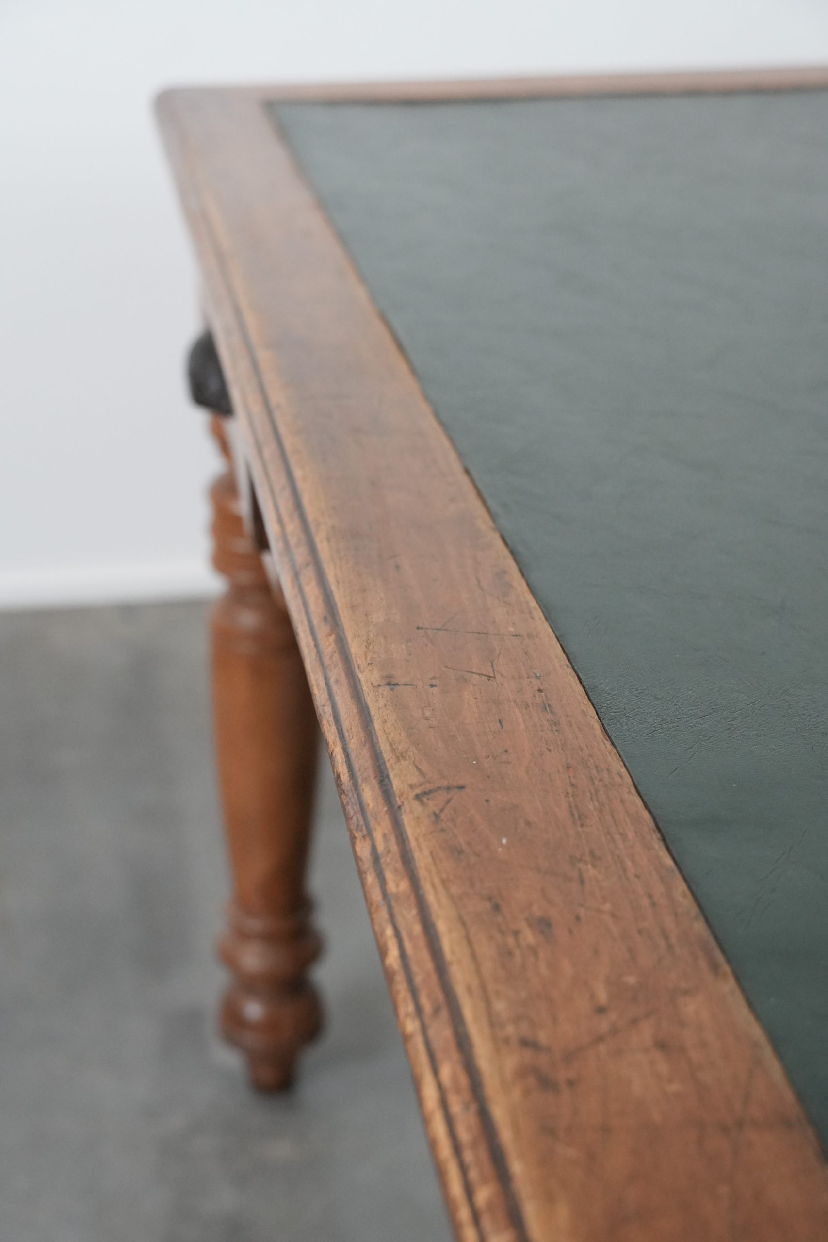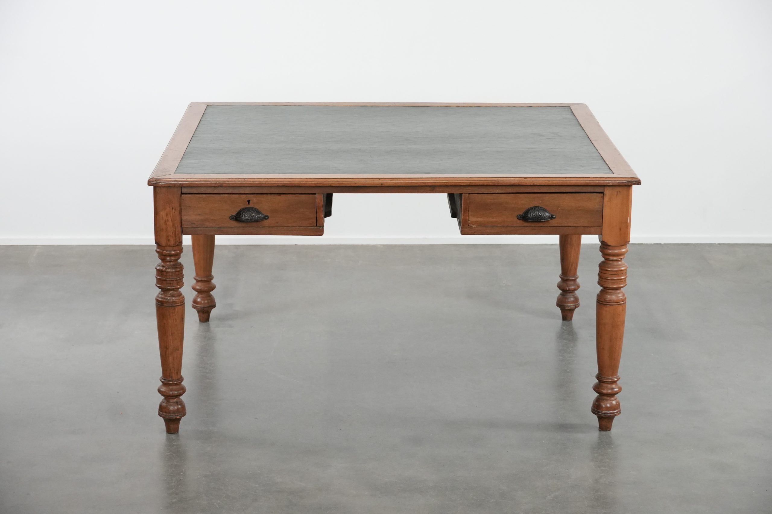 Deze antieke schrijftafel/ partner desk is een prachtige en luxe toevoeging in nagenoeg iedere ruimte. Hij komt uit eind 19e eeuw en in zowel een huislijke omgeving als kantoor omgeving komt hij perfect tot zijn recht. Door zijn 4 lades is hij ook zeer praktisch, en biedt u dus voldoende opbergmogelijkheden voor uw spullen. Hij is voorzien van een prachtig groen lederen blad. De tafel laat normale gebruikssporen zien, wat past bij zijn leeftijd en karakter. Bij gepast gebruik en onderhoud zal u nog lang van deze zeer mooie en direct inzetbare tafel kunnen genieten.