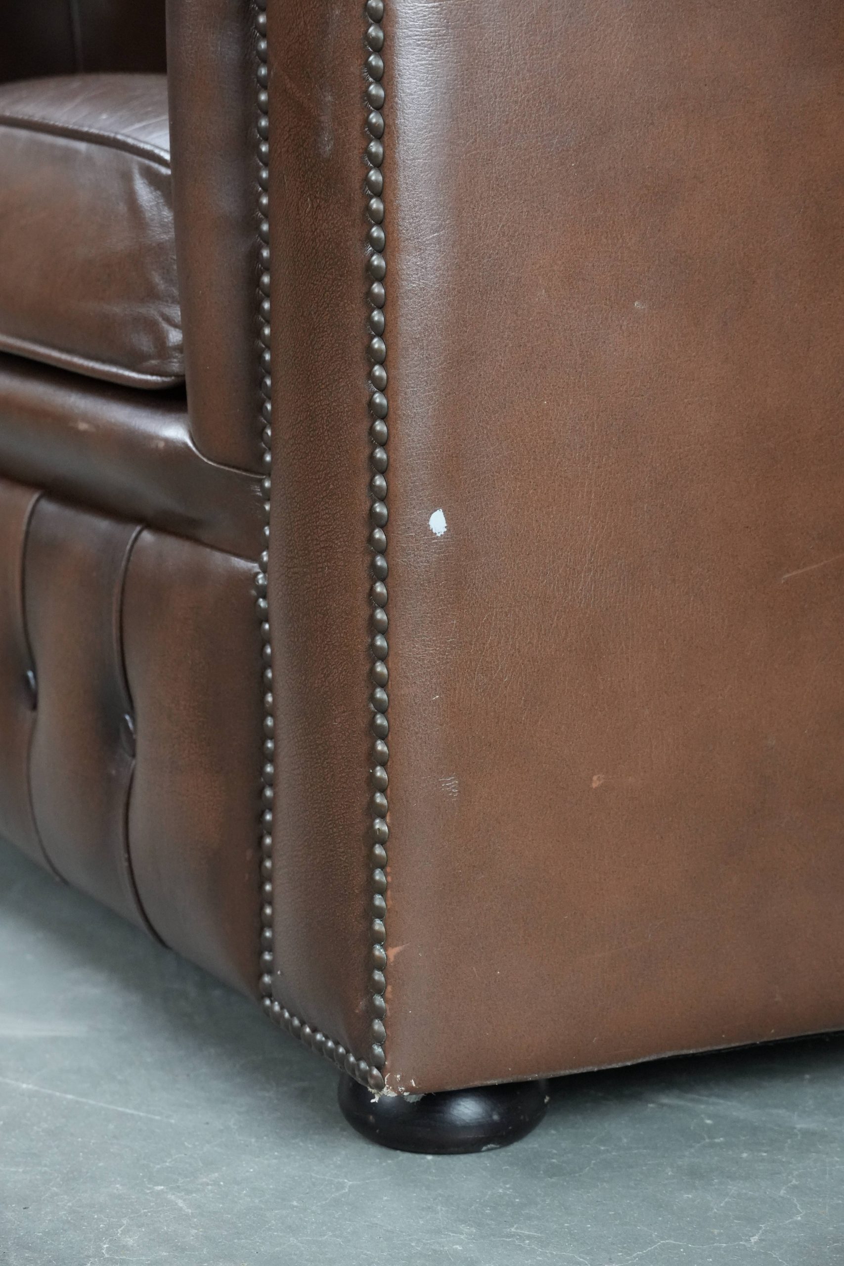 Deze geweldige rundleren chesterfield clubfauteuil in Engelse stijl past in zowel een klassiek als in een modern interieur en komt in iedere ruimte perfect tot zijn recht. Hij heeft een klassieke uitstraling en voegt net wat meer charme en elegantie toe. De fauteuil heeft een afwerking met siernagels en is voorzien van een los zitkussen. Hij biedt u een fijn en correct zitcomfort. Door jaren van verantwoord gebruik heeft hij normale gebruikssporen opgelopen. Structureel is hij in goede en direct inzetbare staat. Waar zet u hem neer?