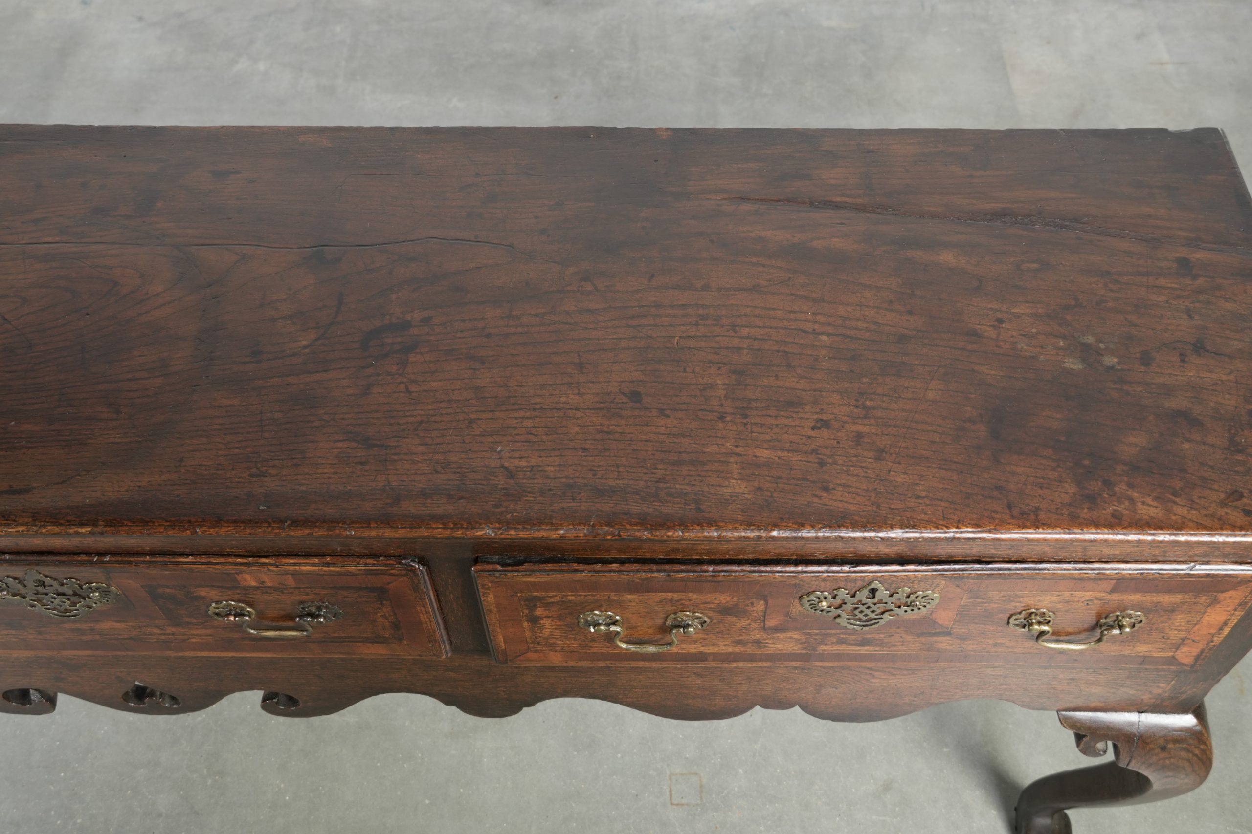 Dit prachtige Engelse eikenhouten dressoir/ side table komt uit de 18e eeuw en is voorzien van sierlijke goudkleurige elementen. Hij heeft drie soepel lopende lades, waardoor hij u voldoende opbergmogelijkheden biedt. In zowel een klassiek als modern interieur komt hij in de door u gekozen ruimte perfect tot zijn recht. Hij heeft twee mooie elegante gevormde poten, wat hem mede tot een ware blikvanger maakt. Door zijn leeftijd heeft hij normale gebruikssporen opgelopen, wat bijdraagt aan zijn authentieke karakter. Structureel is hij in goede en direct inzetbare staat. Waar zet u hem neer?