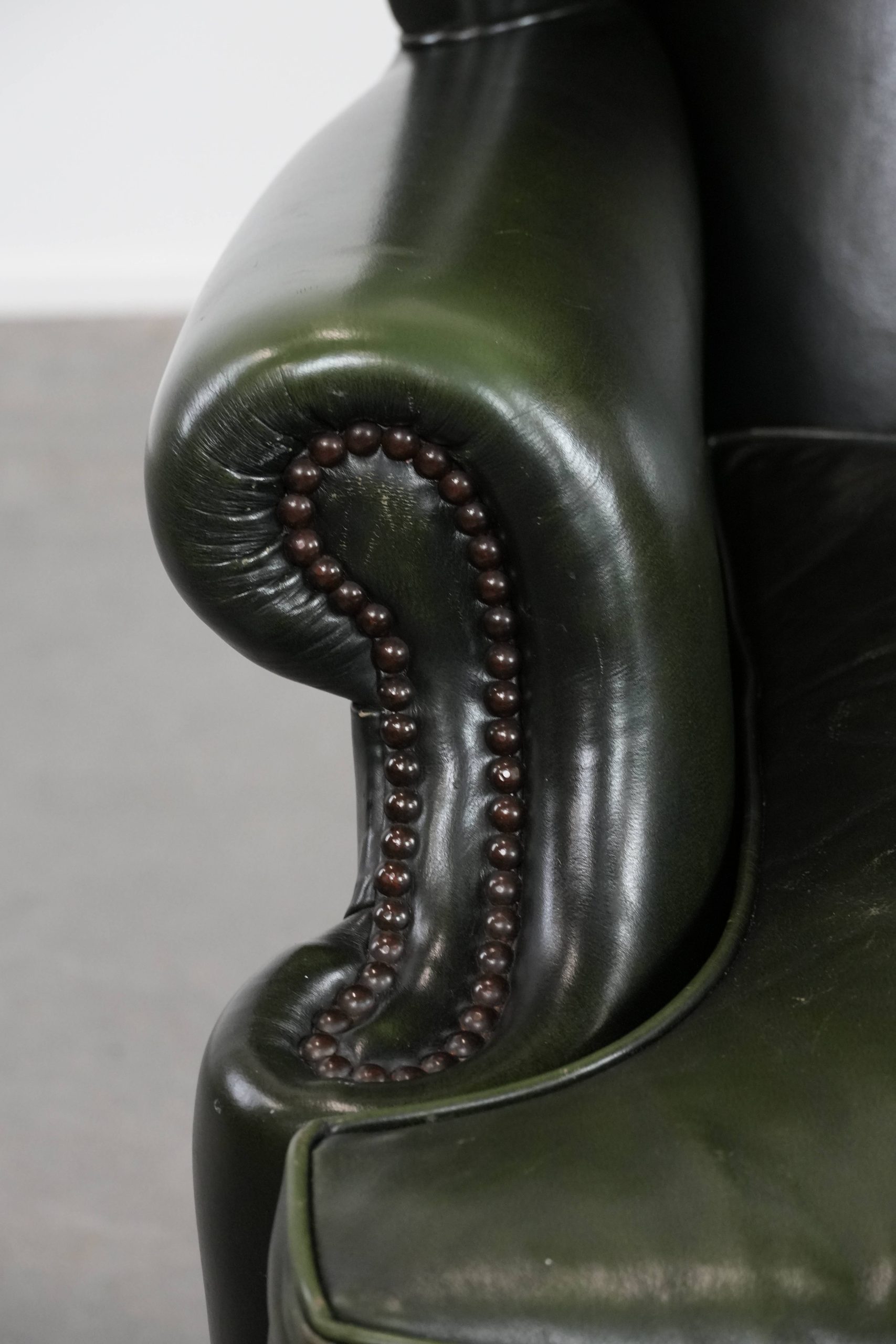Deze prachtige klassieke chesterfield oorfauteuil is gemaakt van rundleer en heeft een mooie, stijlvolle donkergroene kleur. De fauteuil is afgewerkt met siernagels en is voorzien van een los zitkussen. Een tijdloos en elegant item dat perfect past in een klassiek of modern interieur. Een blikvanger in bijvoorbeeld de woonkamer, maar ook in een kantoor- of winkelomgeving komt hij perfect tot zijn recht. Door verantwoord gebruik heeft hij normale gebruikssporen opgelopen. Structureel is hij in goede en direct inzetbare staat, en bij gepast gebruik en onderhoud zal hij u nog vele jaren van zit – en kijkplezier voorzien.