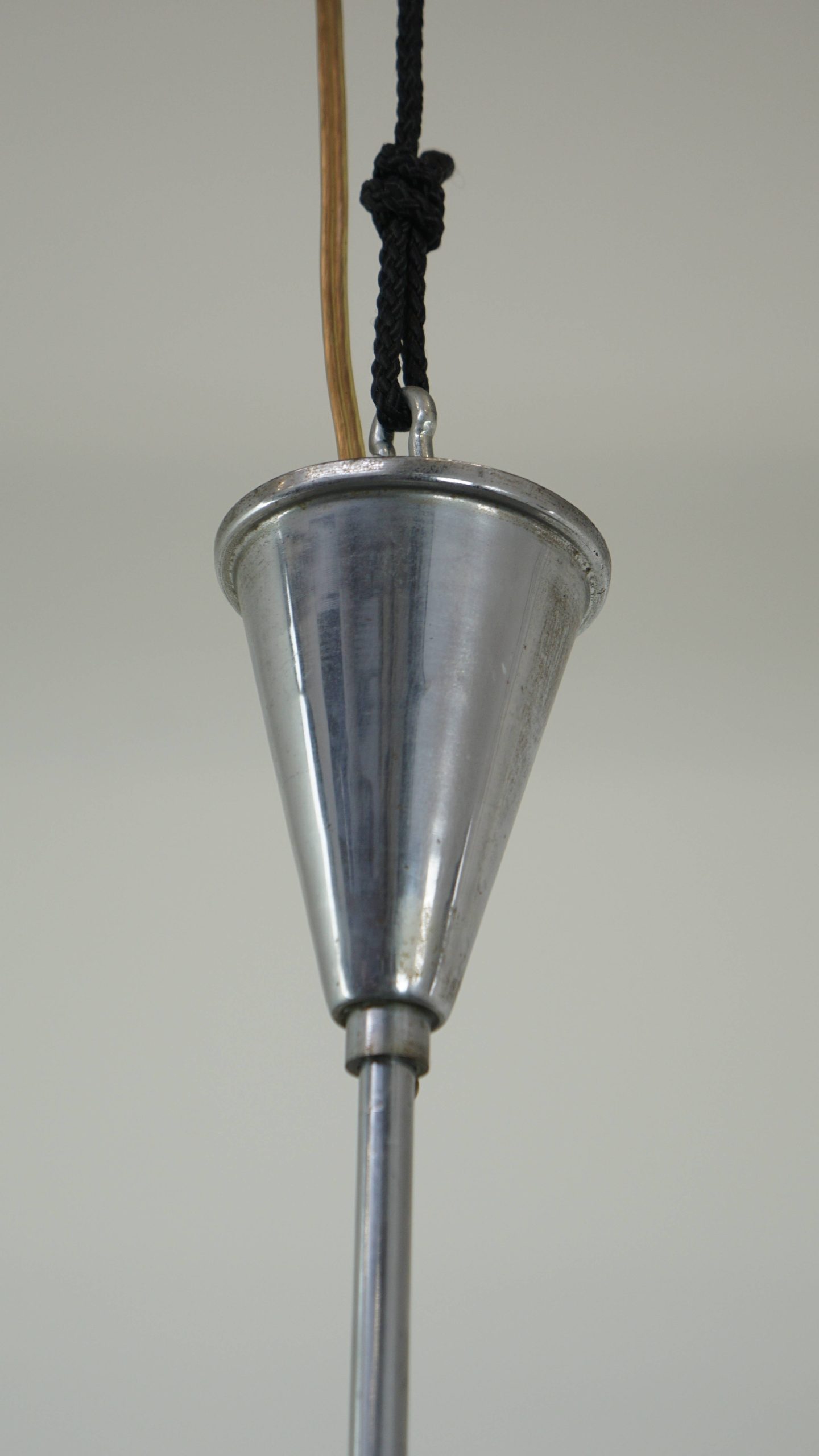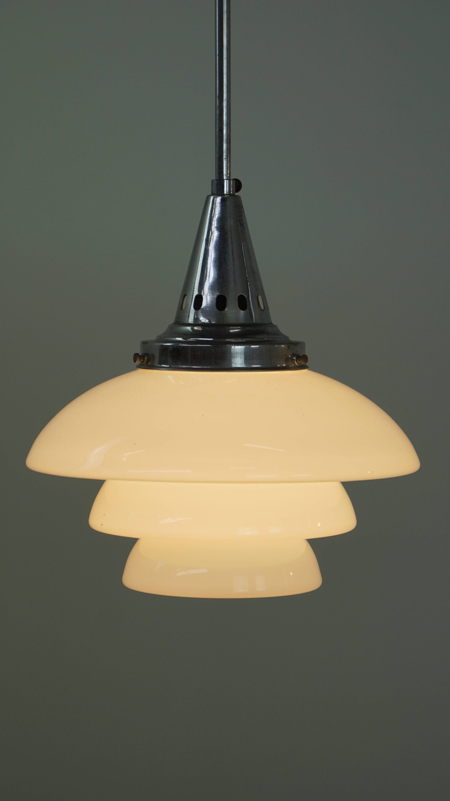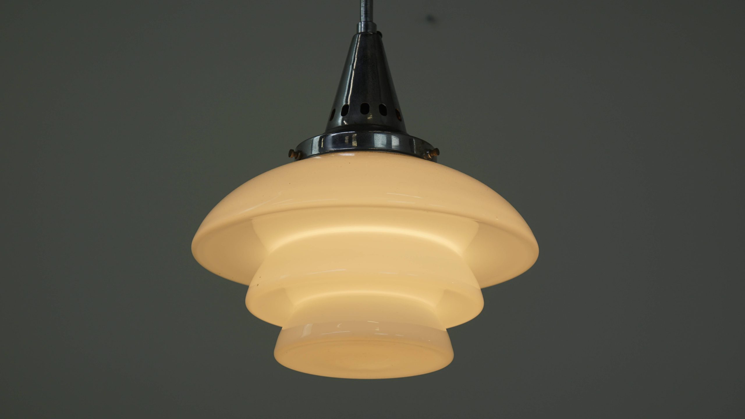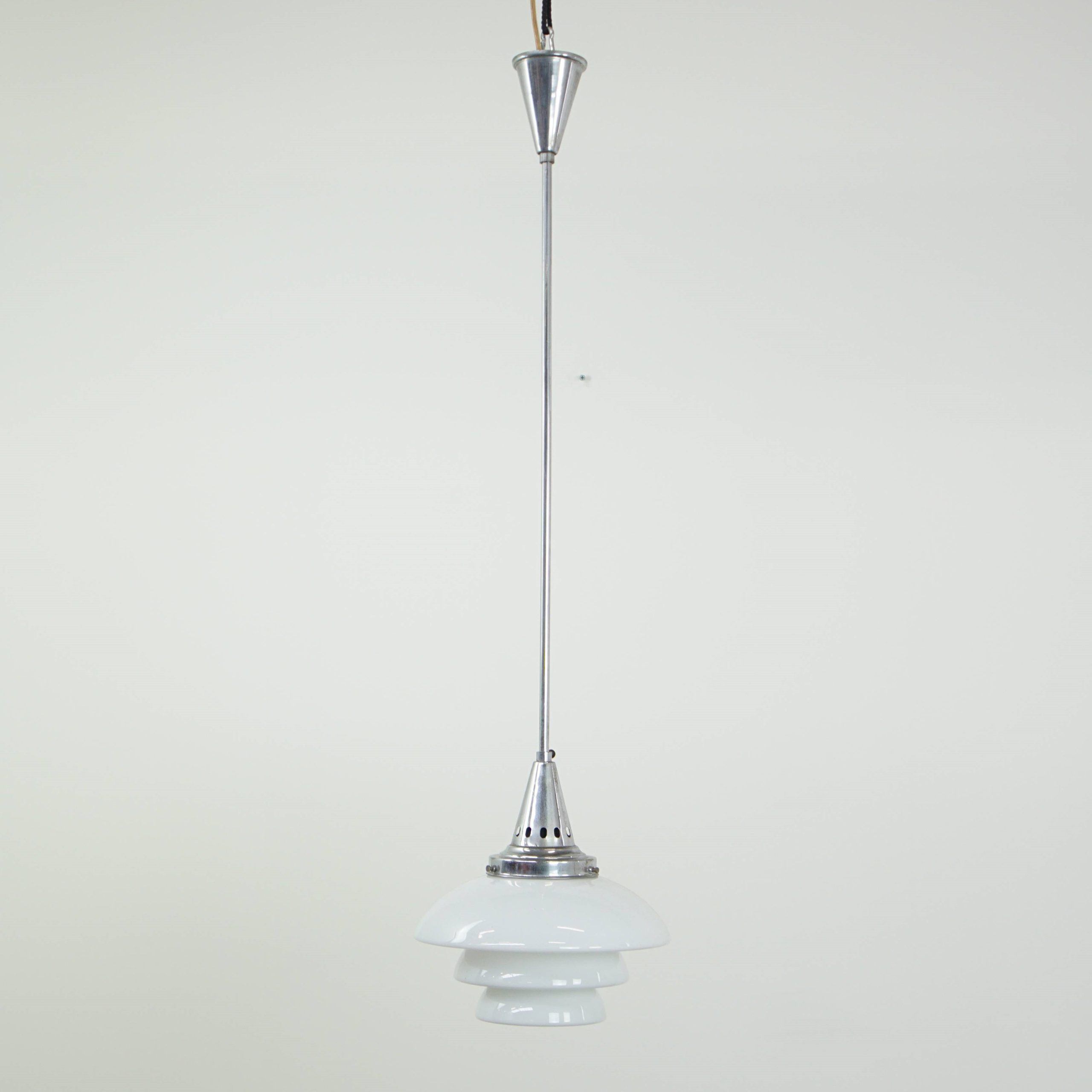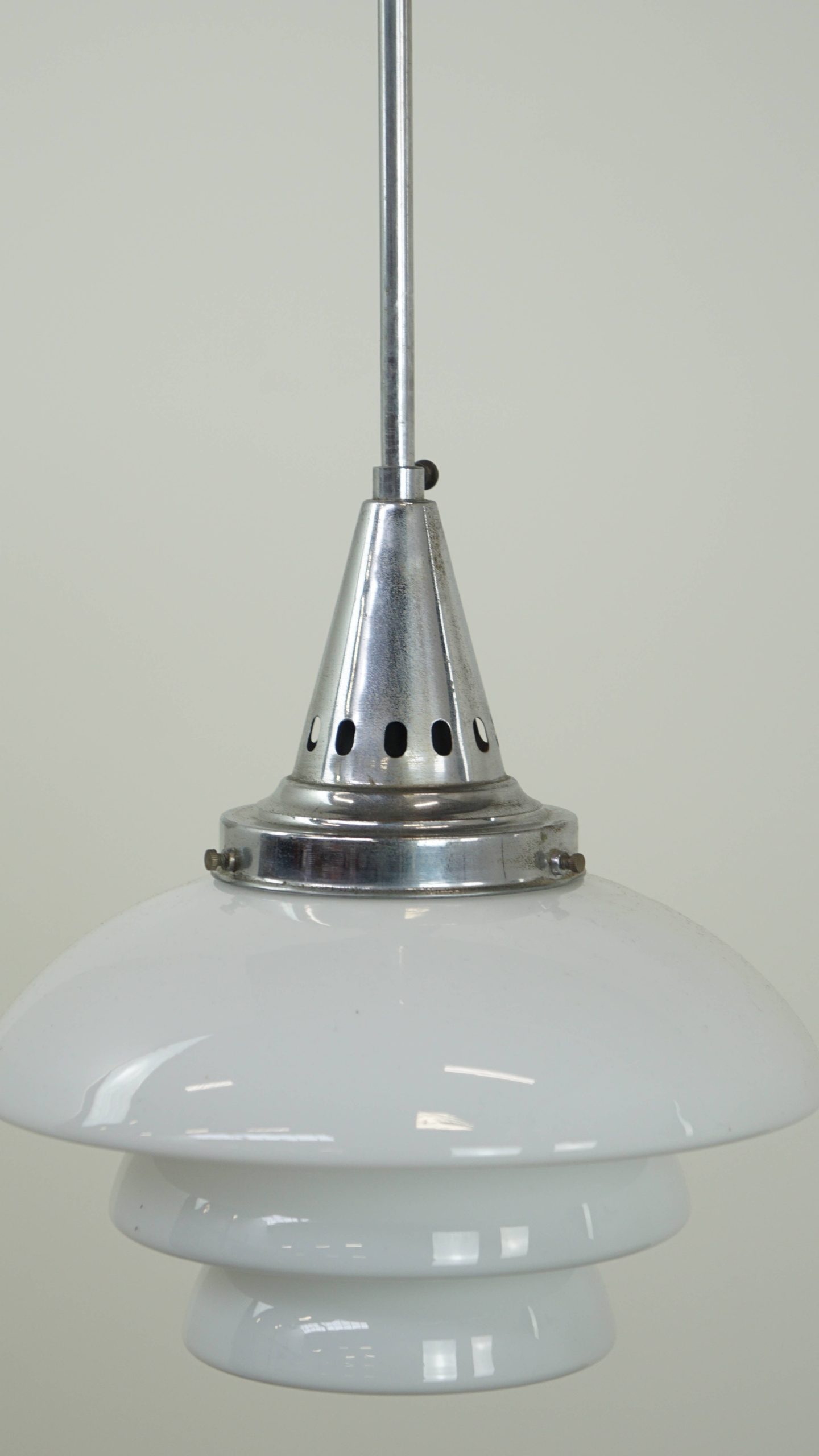 Deze sierlijke vintage hanglamp is een charmante toevoeging aan elk interieur door de combinatie van een trapsgewijze kap van wit melkglas en een verfijnd chromen armatuur. Het tijdloze ontwerp zorgt voor een warme en sfeervolle lichtverspreiding boven de tafel, in de hal of in een gezellige hoek.