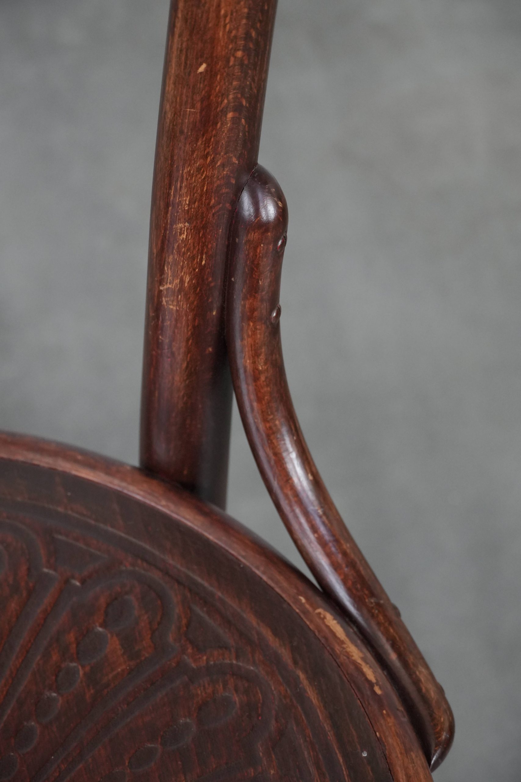 Deze geweldige vintage houten bistro stoel heeft prachtige tekeningen/ motieven in de zitting- en rugleuning. Hij komt in zowel een klassiek als in een modern interieur goed tot zijn recht. Door de jaren heen heeft hij een prachtig patina verkregen en heeft hij, zoals op de foto’s te zien, in het verleden een paar reparaties gehad. Structureel is hij in een goede en direct inzetbare staat. Bij gepast gebruik en onderhoud zal hij nog jarenlang meegaan!