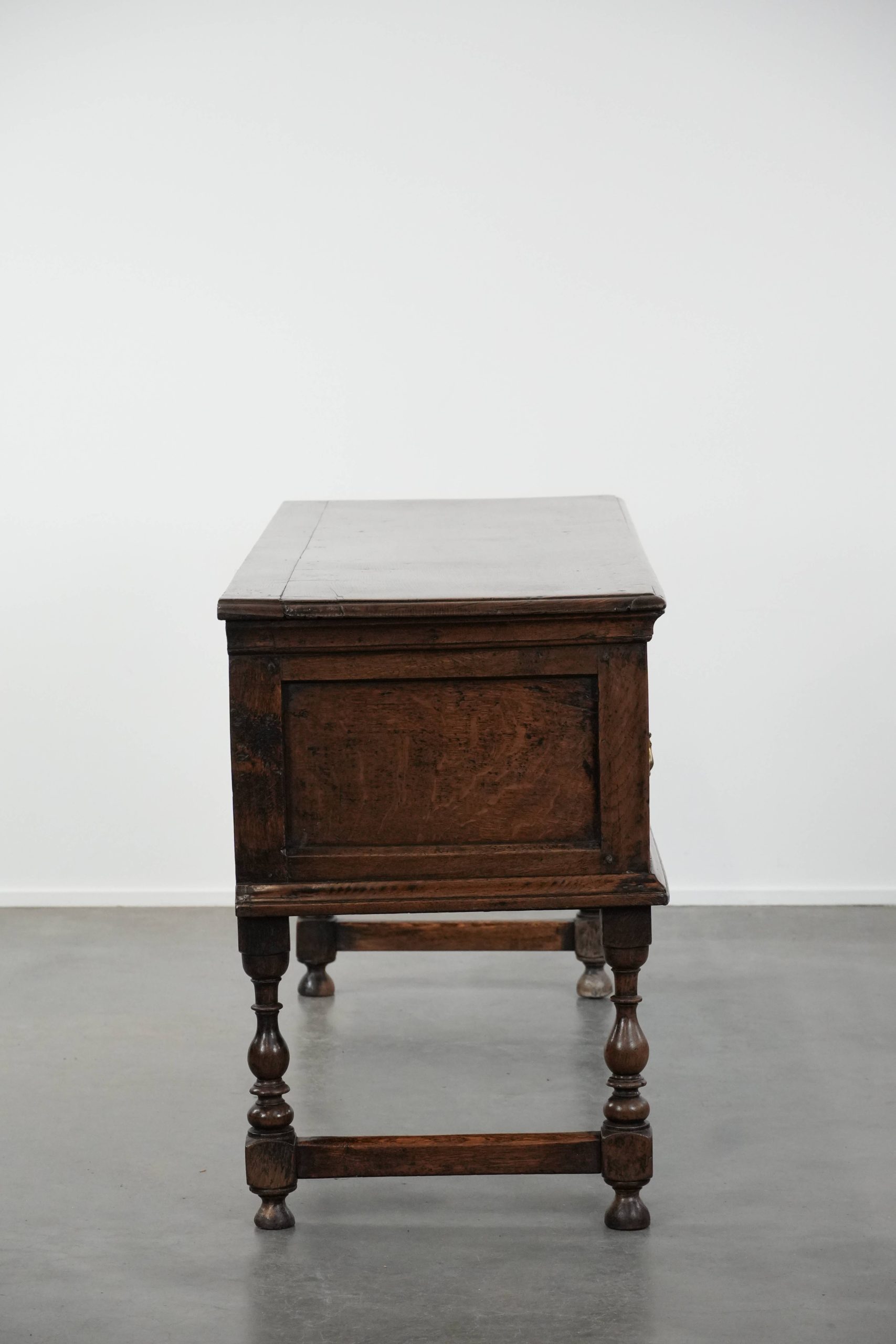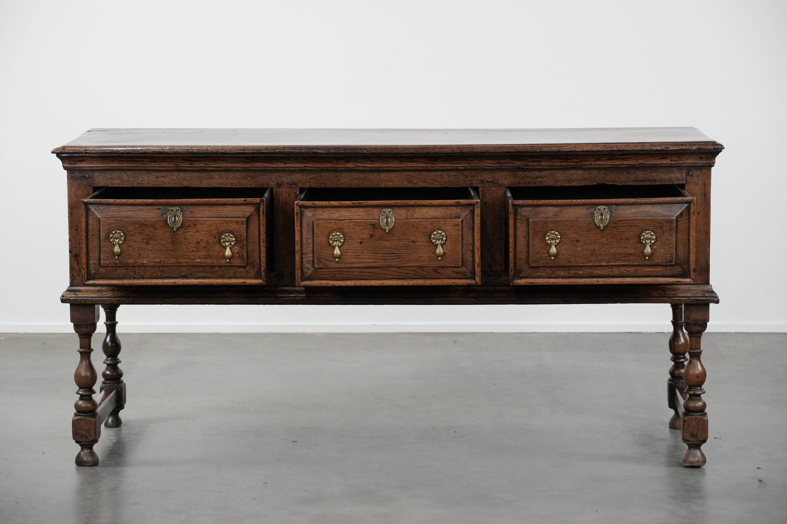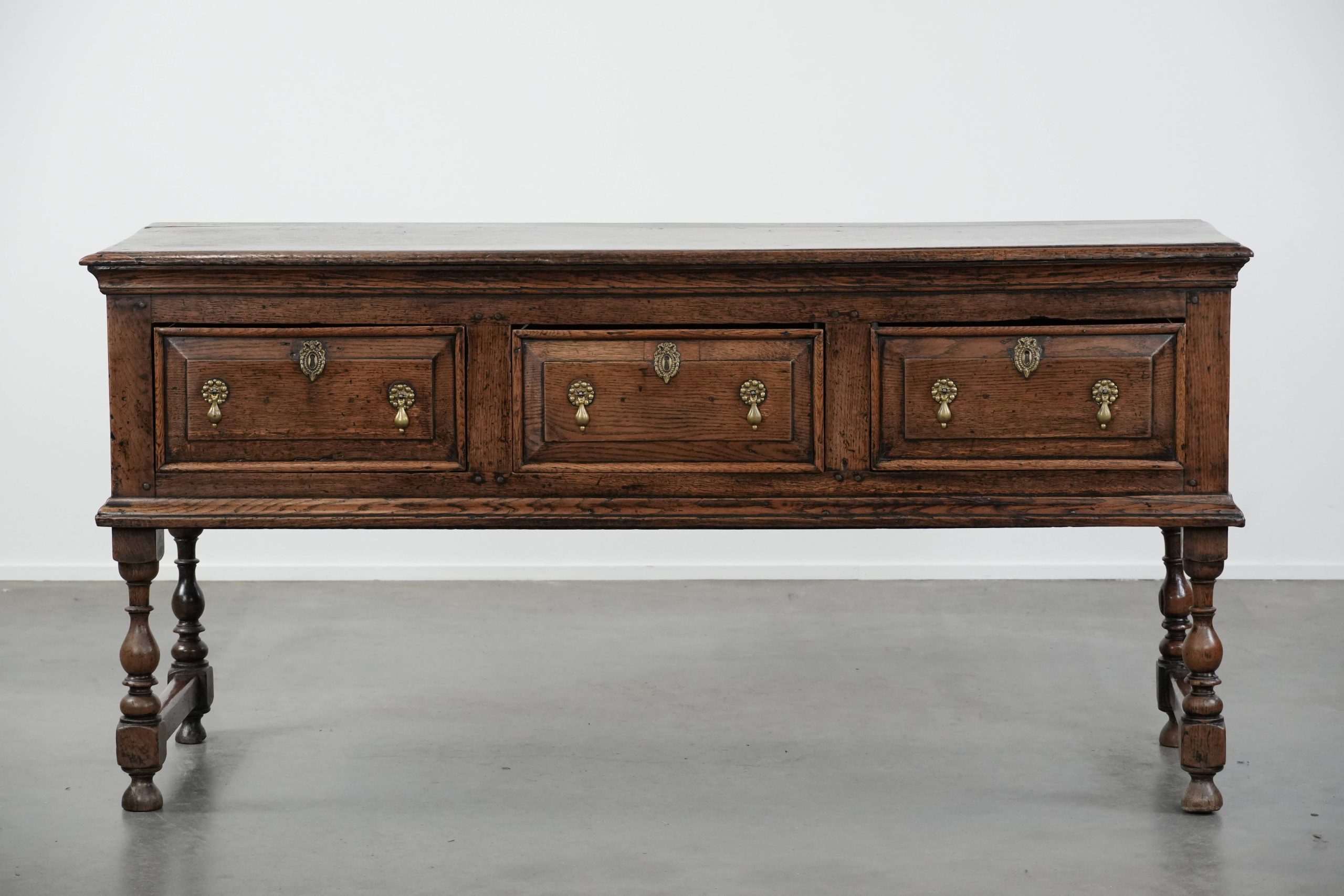 Dit dressoir is een waar pronkstuk voor elk liefhebber van echte antieke items! Dit item komt uit de 18e eeuw en laat zich gemakkelijk plaatsen in zowel een klassiek als in een modern interieur. Hij is gemaakt van eikenhout en uitgevoerd met drie lades en biedt u daardoor voldoende opbergmogelijkheden. De lades zijn voorzien van stijlvolle goudkleurige grepen, die een vleugje elegantie toevoegen. Door jaren verantwoord gebruik heeft hij normale gebruikssporen opgelopen, wat bijdraagt aan zijn prachtige patina. Structureel is hij in een goede en direct inzetbare staat en bij gepast gebruik zal u nog jarenlang plezier hebben van dit item! Waar zet u deze blikvanger neer?